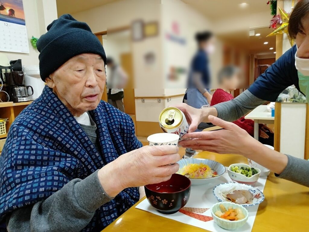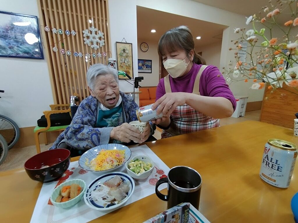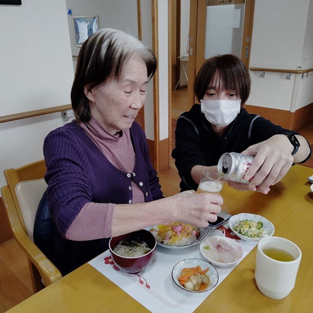 皆さん飲む飲む(^o^) ※ノンアルコールビールやジュースも用意しています 「もう、こっちは入っとらんよ~(缶を振り振り)」 「まだ(ビール)入ってる?」 「美味しいねぇ」 「ご馳走やねぇ!今日は何の日?」「私、そんなに飲みきれんよ・・」 そんな会話が各フロアから聞こえてました。